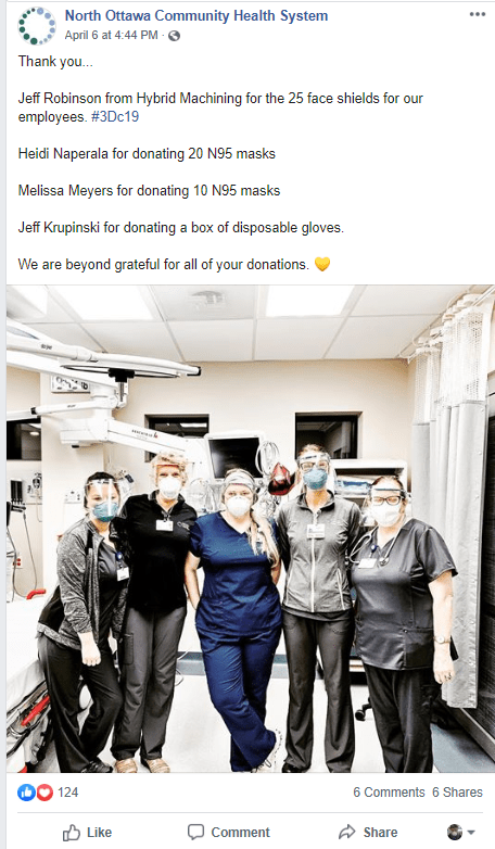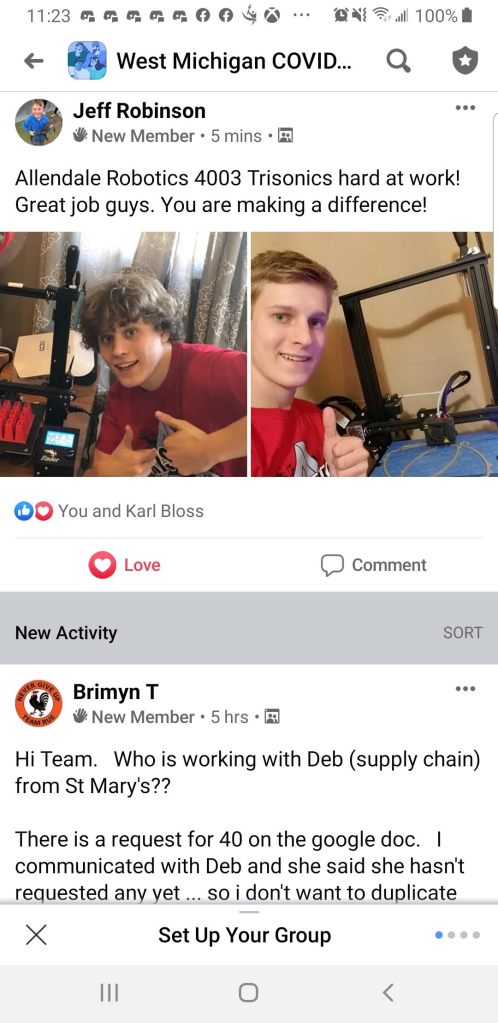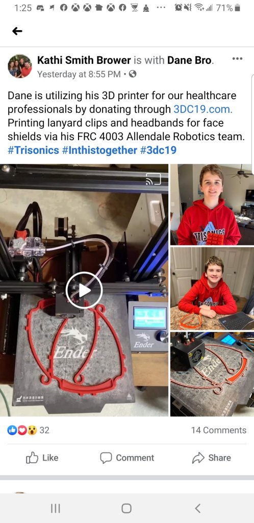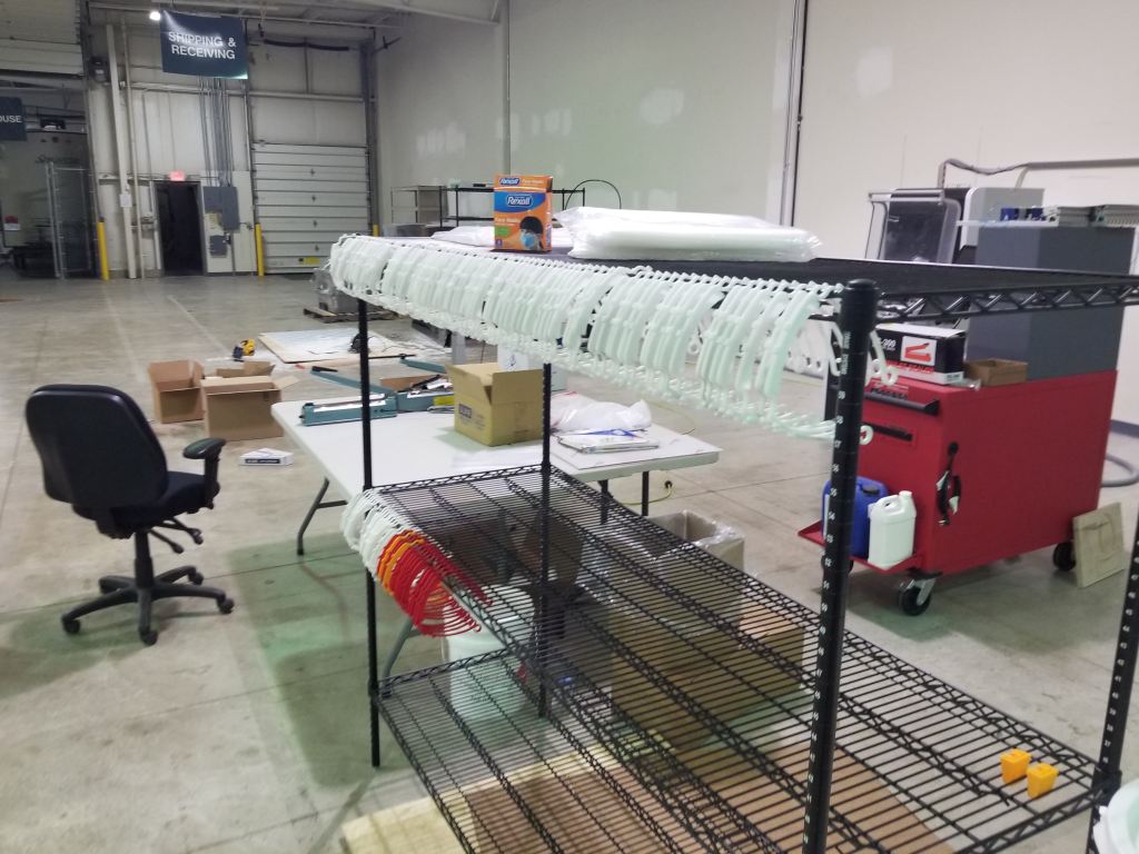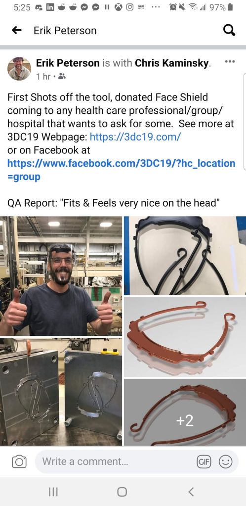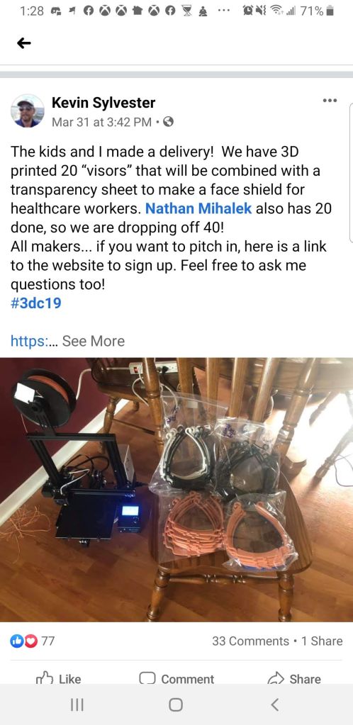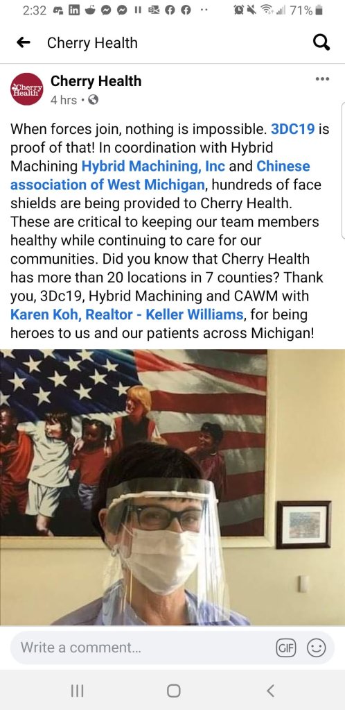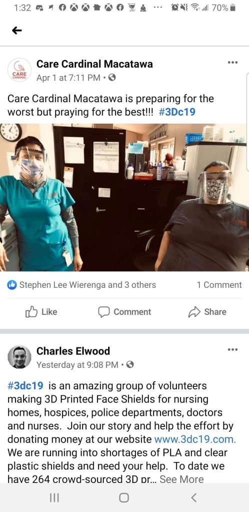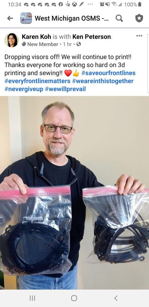 The movement started to gain steam and traction when several group made the decision to combine efforts into 1 local West Michigan group. We focused on 1 design, the 3DVerkstan face shield and even setup a distribution center at Hybrid Machining (Jeff Robinson) in Holland, MI.